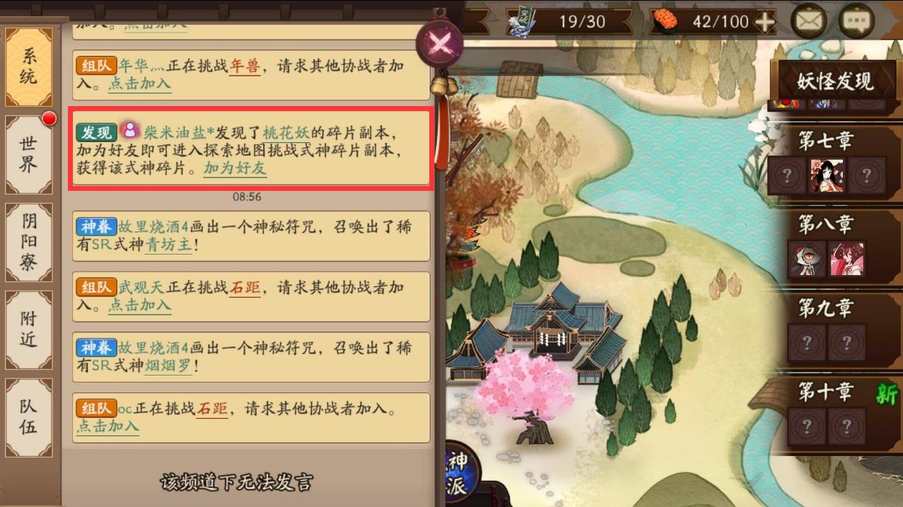 式神碎片副本被触发的时候系统会发公告,好友可以共享副本。