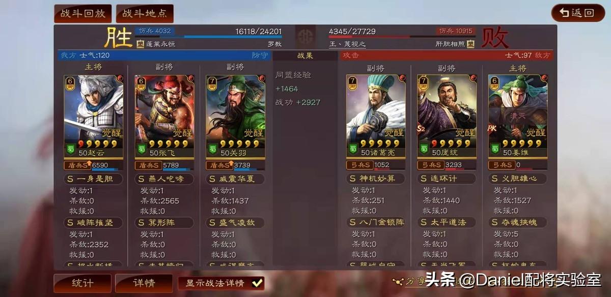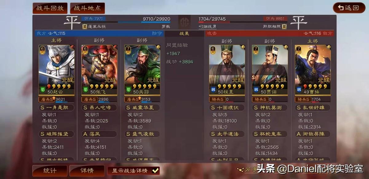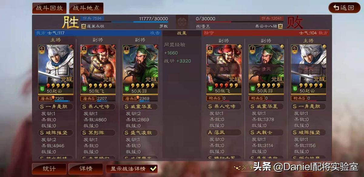 战斗中,6000兵对战几乎满编的桃园盾,也能碰掉1w3的兵力,爆发能力之强可见一斑,妥妥的拥有绝地反杀的能力。在战场上,建议此队,重伤不要回家,多打几场,兵力在1w以下再征兵。