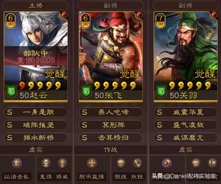 这里的五虎由赵云、张飞、关羽组成的一队盾兵,赵云因为稳定,在这里当主将,拿到8%会心加成,能稳定地增加伤害,同时赵云也是本队“最肉武将”,能一定等级上避免爆头。