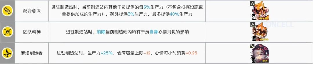 这一类新的加工站干员的属性是:在加工指定某个系列的材料时,拥有着超高的加成,且会降低心情消耗。是目前的最优解。如果未来有更多这种分类的干员上岛,会直接导致任意类材料加工干员下岗。