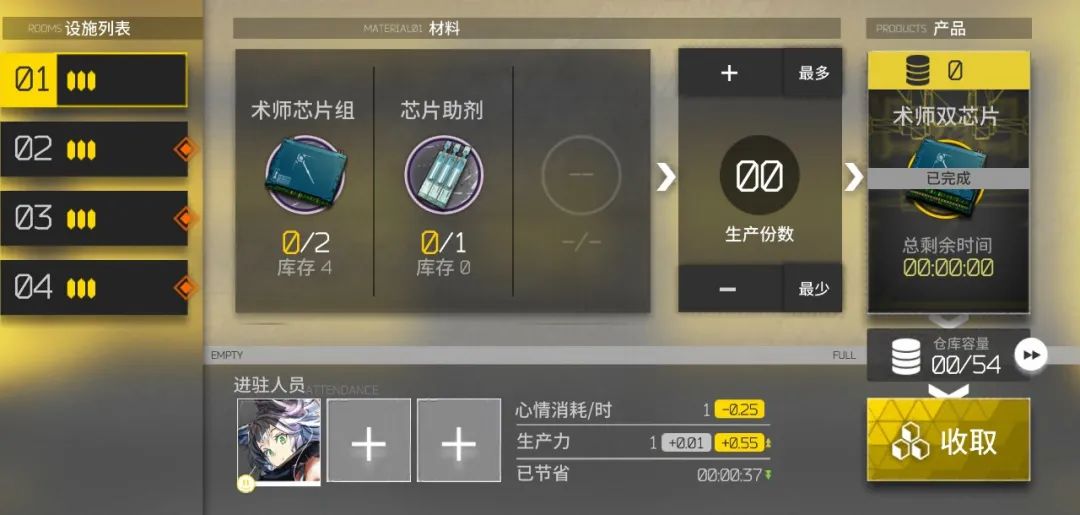 3、降低消耗系材料加工:目前主要以六星重装干员瑕光为主,其核心是:不注重提高材料的副产物加成,而是降低合成材料的消耗。非洲博士的福音技能,目前瑕光最多能节省400龙门币,降低4点心情消耗。