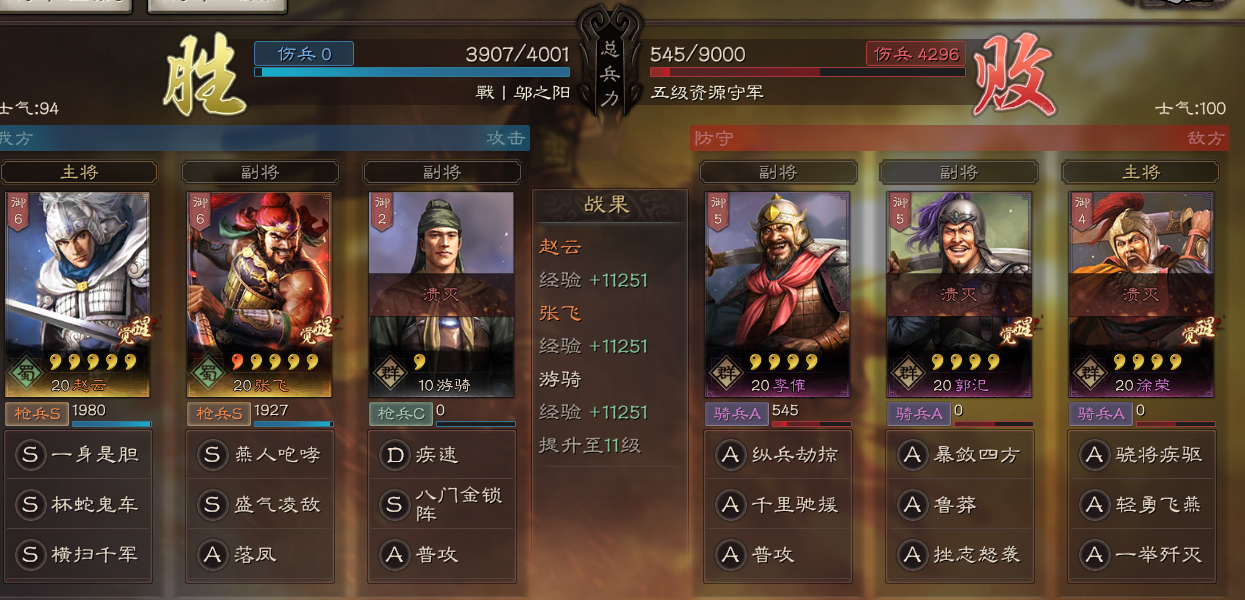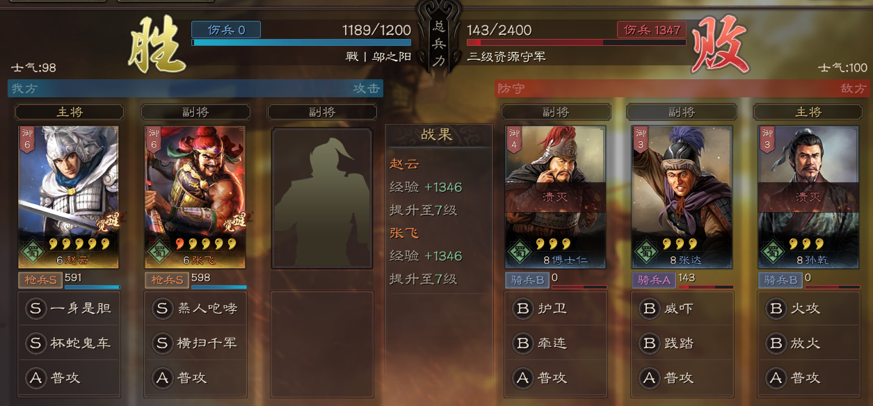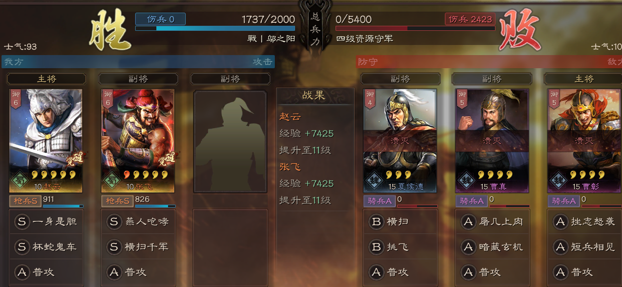 一般这时候赵云带杯蛇鬼车加横扫千军,张飞补一个盛气加一个瞬发输出,工具人1兵带阵法或者兵种配合。