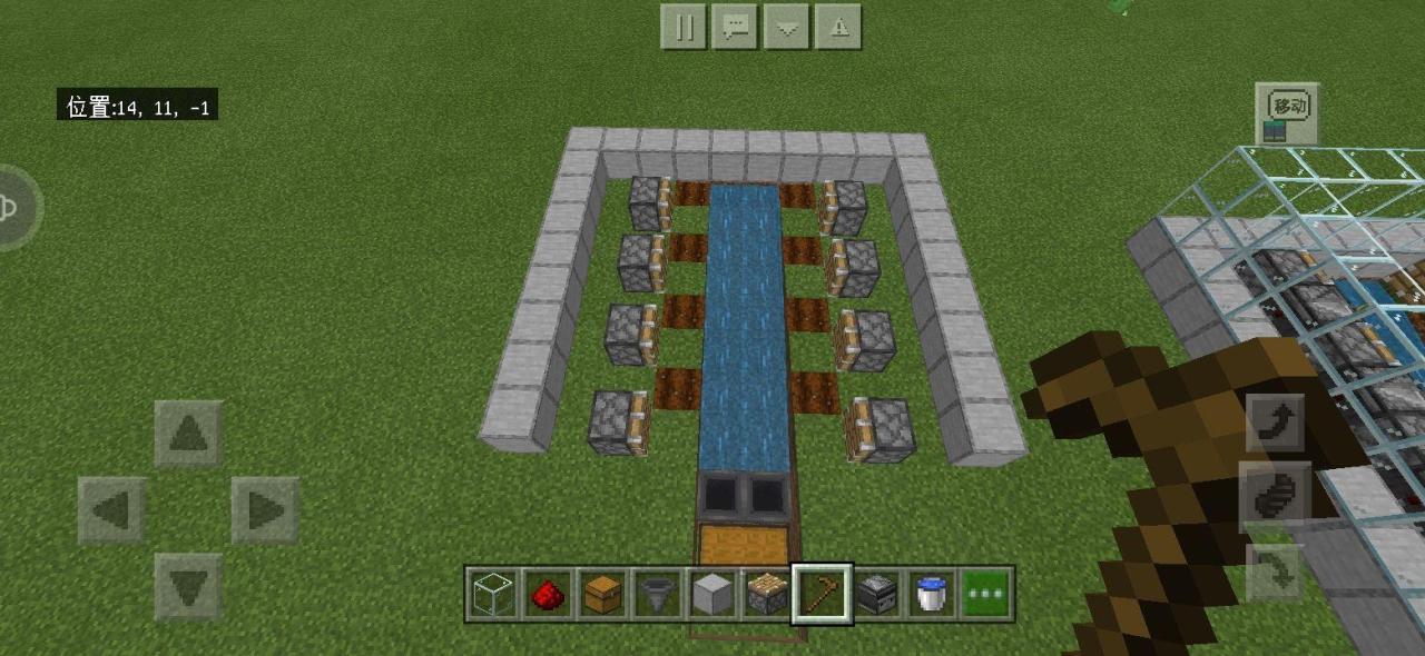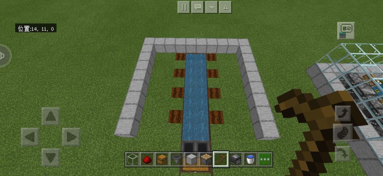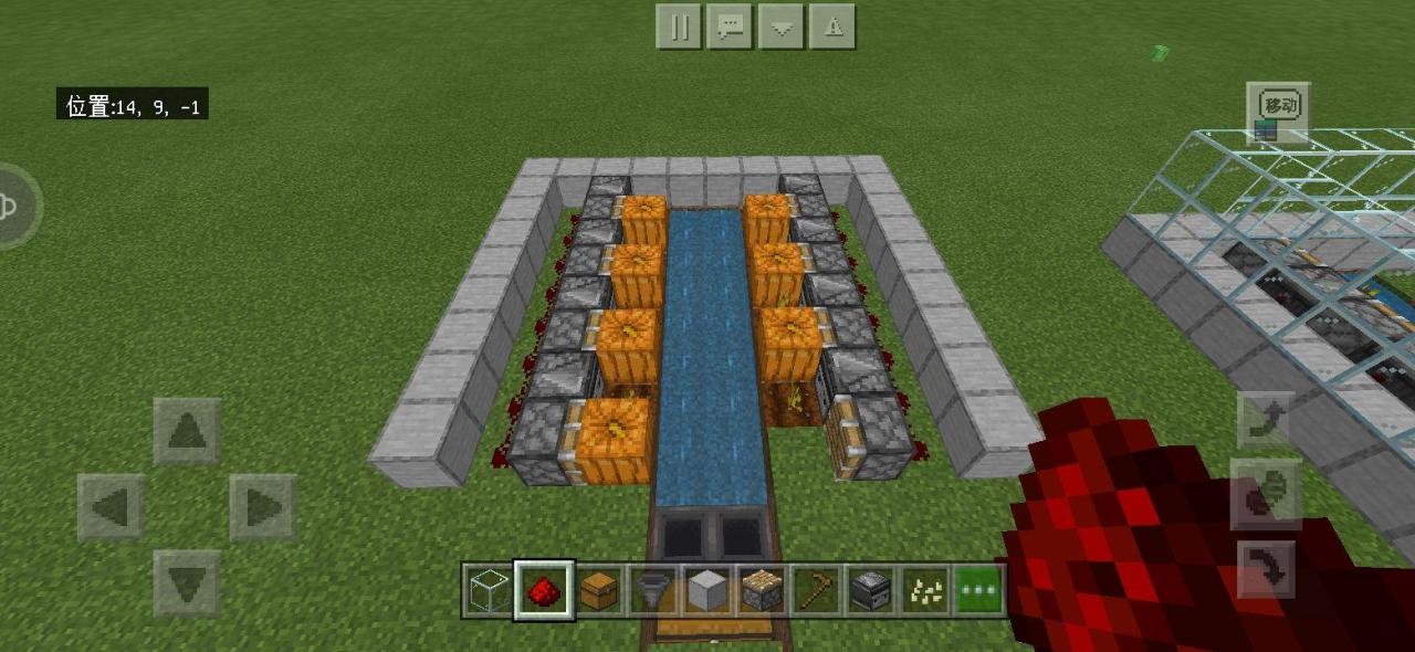 第四步,在水旁种植南瓜,每搁一格放一个南瓜种子。