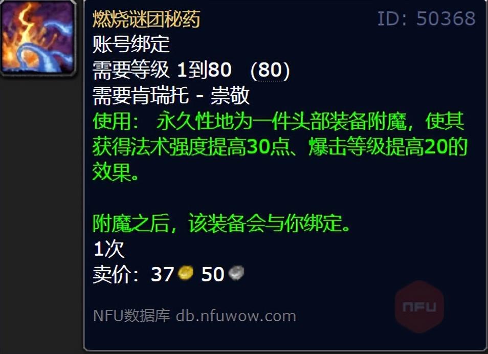 其次是法系职业需要刷的肯瑞托阵营声望,燃烧谜团秘药是法系职业的头部毕业附魔,另外还有裁缝职业的天蓝魔线也是法系职业的腿部毕业附魔。