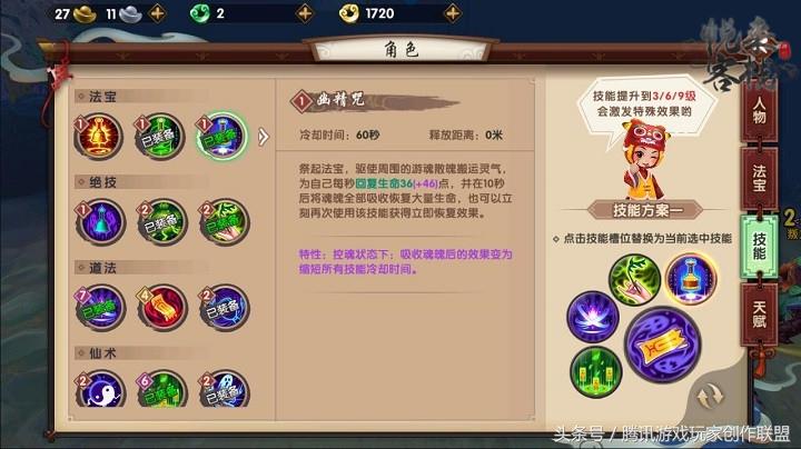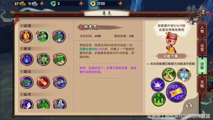 冷却时间60秒,释放距离0,技能效果为祭起法宝,给身边八米内ID友方单位加血一次,回复一定生命,并且套上一个吸收伤害的护盾,褫夺最多吸收的伤害会根据仙友提升而提升,效果持续20秒。