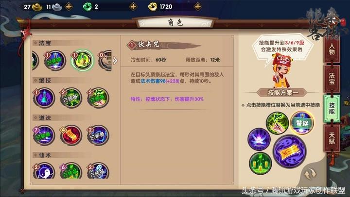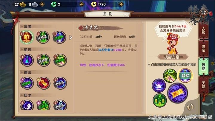 冷却时间60秒,释放距离12米该技能效果为在目标头顶祭起法宝,美标对其周围敌人造成法术伤害,持续十秒。