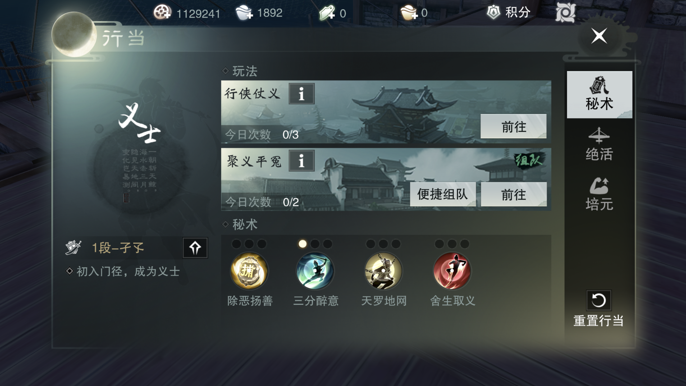 行当玩法分为山珍海味、聚义平冤、弈中幻境、江湖行商、白榜追击,前四个需要组队白榜一个人做即可,前四个和新秀本一样组队挂机就行,而做行当日常最重要的奖励则是获得见识可以点培元提升人物属性。江湖行商获得的上票一共给帮派商人可以增加帮派贡献,对于自己的修为增长十分有益。