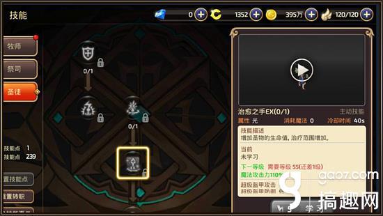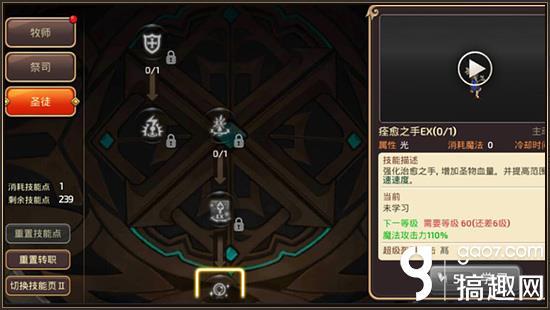 55级第二个EX技能:治愈之手EX——治愈之手,我们看字面意思就知道,这是一个治愈类技能,它也是属于召唤类圣物(柱子2号),治愈之手的效果就是在它周围一定范围内可以给友方所有目标(其他职业召唤物也是)回复血量值,呈多段表现。所以当你的血量不满时,这时候祭祀放了一个回血柱子,过去吧,享受奶爸的恩惠。(值得吐槽的是,其实血量回复的真的不算很多)EX强化了柱子本身的血量(一样是为了不被boss拍碎)和治疗范围,可以让队友更加轻松的享受到治疗效果,而治疗量是跟圣徒的自身属性有关,所以EX的伤害增加就是奶量增加了,有利无弊的加强。PVP当中,圣徒基本上都是带这治愈之手PK的,给自己回血,拖延一些被动的时间,又或者挡住对手,战略意义明显,在很多擂台赛车轮战中,血量的优势非常重要,而可以回血的技能,自然是让人美滋滋。