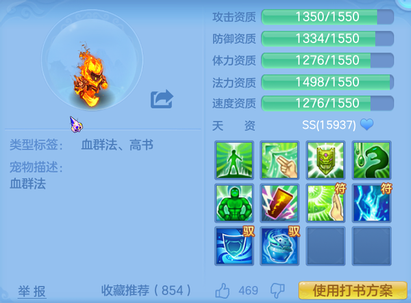 在法系宠物中帝火可以打造为血毒法宠,首先血毒法在对局中能提高法术输出的同时提高宠物的血量,并以高级毒来弥补宠物的输出能力。相较于暴力法,高级毒的影响力主要是在对局中能有效的对敌方单位进行持续消耗,并没有特别高的爆发,但是在PVP中配合队友能较好的压制敌方血线,并且还有着一定的克制能力。推荐打书方面选择,高级法术连击、高级法术暴击、高级审判、高级毒并配合护符的AOE法术技能,再打上高级神佑复生、高级防御、高级强壮来确保其在对局中的生存能力,这样一个强力的血毒法帝火就打造完成了。