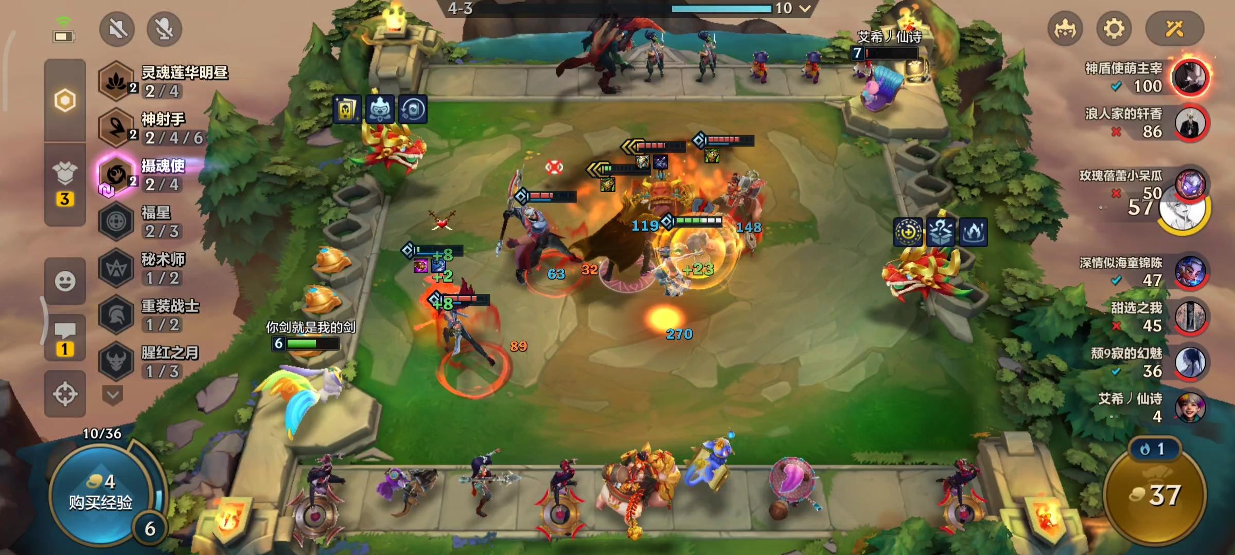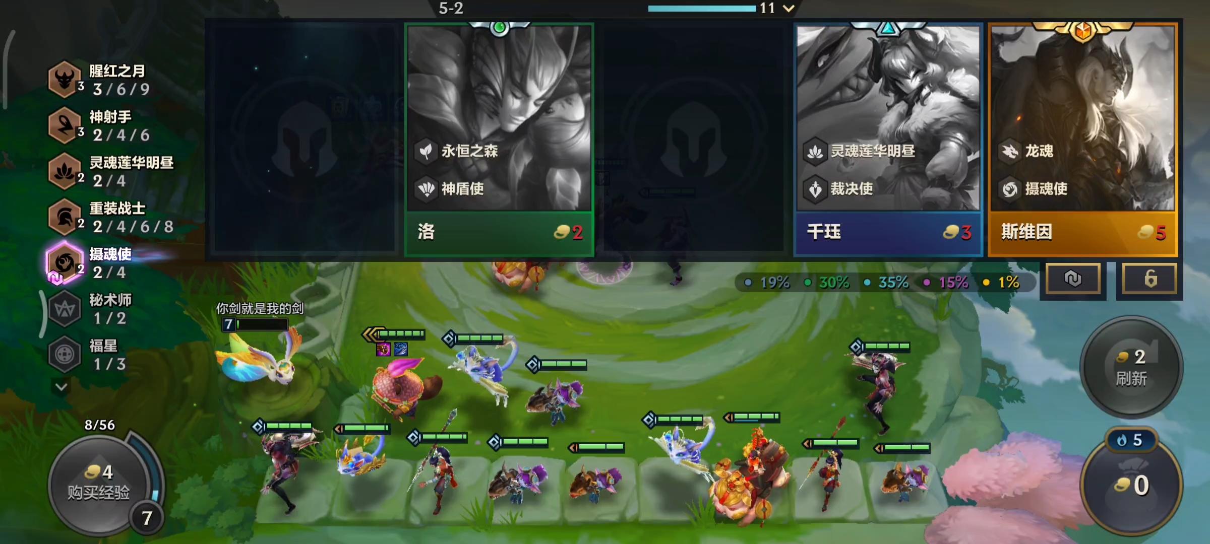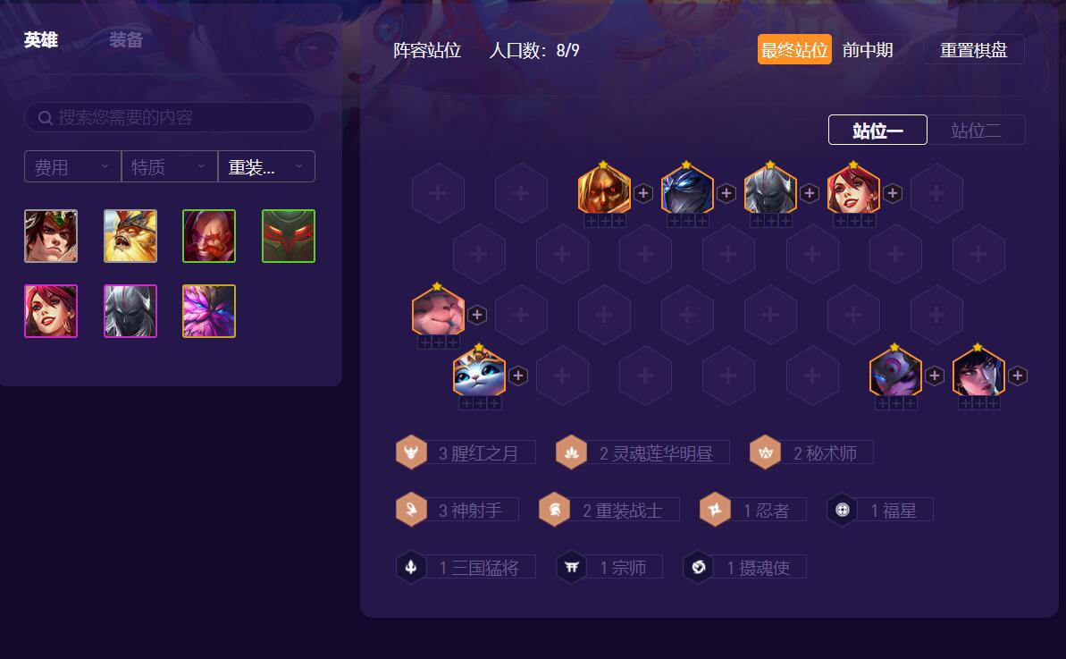 搭配的羁绊有:4神射手、2灵魂莲华明昼、2重装战士、2秘术师、3猩红之月