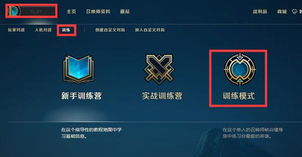 看完以上步骤之后建议大家还是到“训练模式”中练习一下,以上的所有的GIF都是在训练模式中录制的。训练模式目前仅在LCU新版客户端中使用,大家可以通过Play-训练-训练模式进入。