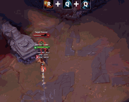 RQQ是比较低级的“输出最大化”策略,伤害与QRQ一致(二段Q有已损失生命值百分比的伤害,所以先R再二段Q会有更高的伤害)。但是因为击飞有一段硬僵直状态所以可行提升Q的命中率,这里的步骤技巧是保证与目标之间没有敌方目标的情况直接朝你R的方向Q即可,除非对方利用水银+位移的连招闪开,否则Q基本都能打中。