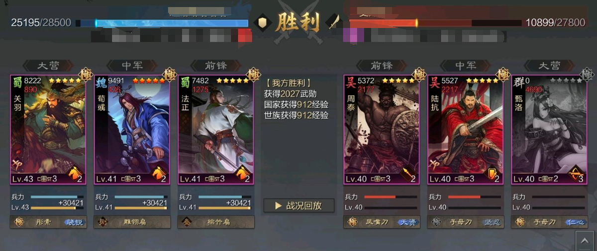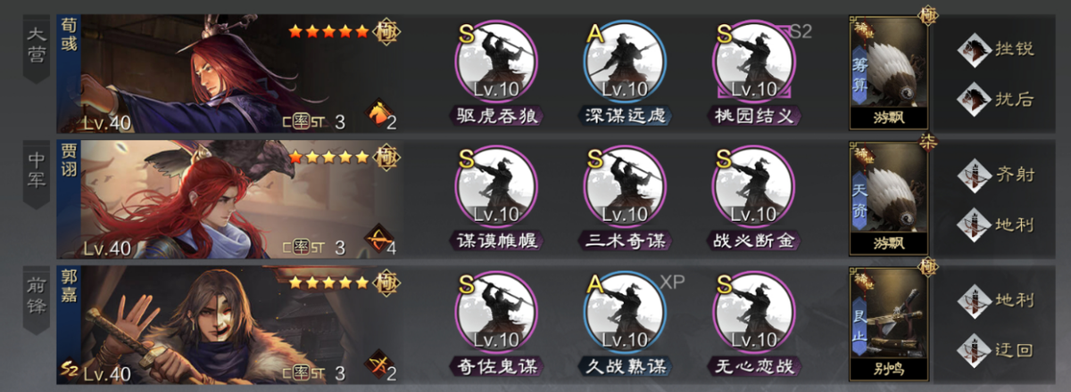魏智队同样也是将荀彧作为大营C,贾诩郭嘉凑生存体系,近期久战魏智表型非常不错,荀彧在郭嘉和魏贾诩的加持下,拥有非常强劲的输出能力,有效克制大张张和肉队,碰到其他队伍也都能打一打,但战损一般不会太低。