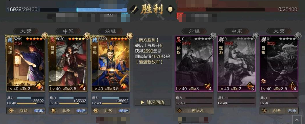 这是荀彧非常经典的一套阵容,荀彧为大营C,吕蒙的自带战法配合反计等控制战法组双封体系保生存,在神兵大赏体系的加持下站在大营位安稳输出。可以说是爆发、穿透、禁疗一应俱全,非常全面。