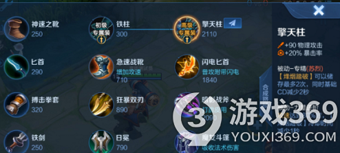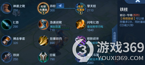 1、苏烈的专精装备分别是铁柱和擎天柱,购买专精装备后烽烟踏破技能只能储存2次,同时冷却时间减少2秒,正常情况下在释放该技能后下三次普通攻击会变成横扫,并且最后一次可以击飞范围内的敌人,使用专精后2次普攻就可以将敌人击飞,大幅提升了开团效率,并且伤害也是非常可观的,当玩家的攻速达到80%的时候,一技能的冷却时间还可以缩减1秒。