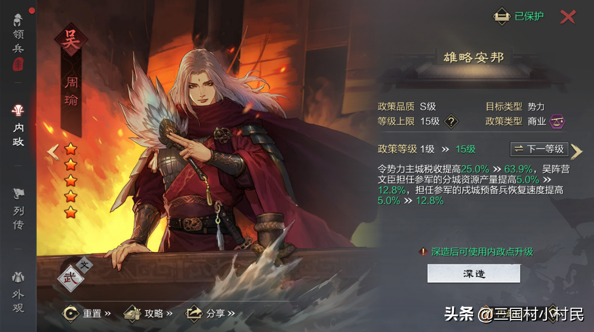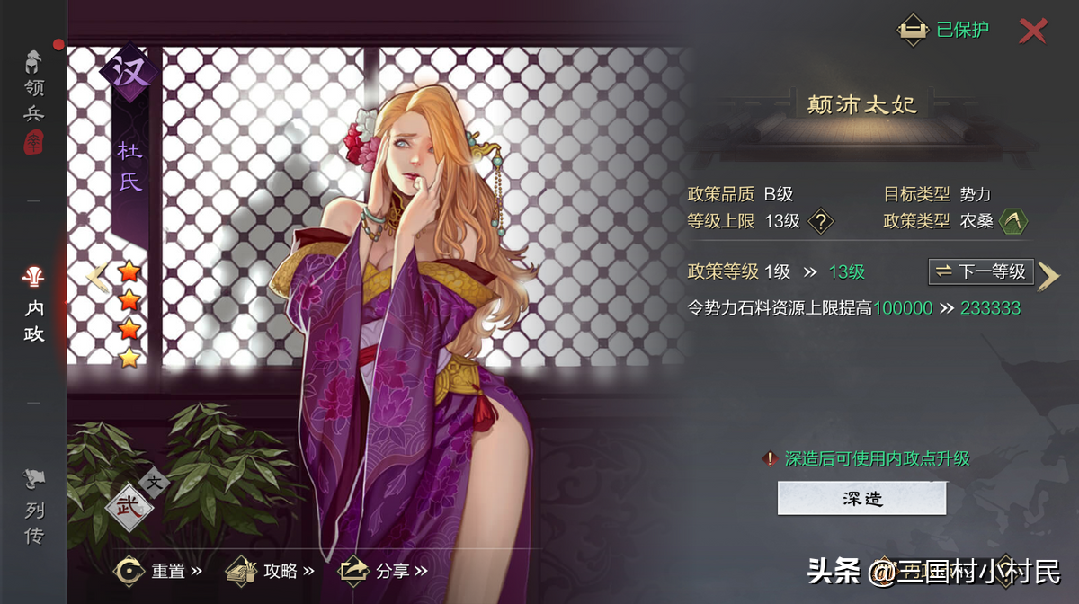 杜氏不用深造升级,拿来做内政武将,对比这些节省下来的资源来讲,2个内政点的浪费根本无伤大雅。