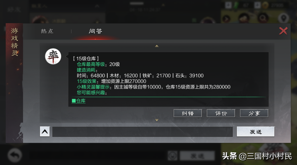 正常玩家老老实实升七本需要15级仓库,这样你的仓库容量才能达到28W,但是如果你用杜氏上内政,只需要把仓库升到10-11级,然后利用贼兵和演武获得石头爆仓就可以升七本了,这一下省下来的资源够你升好几级兵营了。同样的道理,你也可以通过这种爆仓的策略,极限情况下16级仓库就可以爆仓升八本。