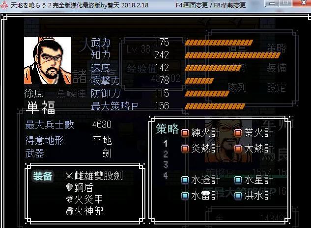 隐藏人物从第六章开始,在野遭遇的敌将会随机出现陶侃、祖逖、杜曾三位晋朝名将,能力都颇高,兵力达3万,恐怖的是武器攻击力255,还都是弓,一出手能干掉我方两人。他们有比较高的概率能掉终极武器,我遇到过七次,S&L了两次,都是没几下就掉宝了,得到了李广之弓和落雷斧。另外,曾在别的地方看到过玉皇大帝,龙马等图样,不知道是什么东西,作者发布的说明文件里似乎也提到有隐藏boss,看不懂日文,难道还另有他人吗?我方武将能力评价顺序姓名武力智力速度武器兵力综合1曹操215230255剑35572曹仁210153200刀04233曹洪185143167枪24024夏侯敦230187210枪2.35075夏侯渊229162217弓2.34836程昱158232130剑04297典韦23896135斧23988荀彧4724572剑03139贾诩9724056剑035310徐晃226175180斧247911张郃225152190弓144612荀攸8223680剑034213曹休19798118弓033014郭嘉3924860剑030515许褚240100135刀240416庞德235148153刀144017张辽232216207刀253418曹真192192234剑247819郭淮200208174弓248420羊祜172229228剑148121钟会150240110剑042322陈泰182214152枪246523邓艾202234230剑252924杜预100223225剑140225夏侯霸220176165枪246926司马懿180250250剑354127曹丕204216235剑3526注:个人制定的综合能力=武力+智力+速度×0.3+兵力×12兵力:观察最终战lv49时的兵力,可大致分成五个等级,A等约为4400,B+等约为4280,B等约为4220,C等约为4000,D等约为3800,ABCD之间正好各相差200人,按照每200兵力折合12个属性点,计入能力总和。这个折算标准为个人所定,假想:武将A武力200,智力200,兵力4400,武将B武力220,智力216,兵力3800,你倾向于派谁上阵?我觉得难以取舍,所以36/3=12,如果你有倾向,可以自行更改你的标准。速度:由于有速度靴存在,低速武将可以得到很大弥补,按0.3折算也是个人所定,观察弓系的郭淮和夏侯渊:按目前折算标准,两人能力总和几乎相同,你更倾向于用谁?我倾向于郭淮一点点,如果你有倾向,可以自行更改你的标准,使两人的能力总和体现出差距。排序后:顺序姓名武力智力速度武器兵力综合1曹操215230255剑355726司马懿180250250剑354117张辽232216207刀253423邓艾202234230剑252927曹丕204216235剑35264夏侯敦230187210枪2.350719郭淮200208174弓24845夏侯渊229162217弓2.348320羊祜172229228剑148110徐晃226175180斧247918曹真192192234剑247825夏侯霸220176165枪246922陈泰182214152枪246511张郃225152190弓144616庞德235148153刀14406程昱158232130剑04292曹仁210153200刀042321钟会150240110剑042315许褚240100135刀24043曹洪185143167枪240224杜预100223225剑14027典韦23896135斧23989贾诩9724056剑035312荀攸8223680剑034213曹休19798118弓03308荀彧4724572剑031314郭嘉3924860剑0305以上数量化数据仅供参考,根据其反映出来的数量差距,更根据实际情况,考虑到武器冲突,可以细说出各角色间的强弱。刀枪弓斧的最强者由高到低为张辽、夏侯敦、郭淮/夏侯渊(难分上下)、徐晃,使同兵器的其他武将基本无法与这几位竞争,但并不是说没机会上场。因为固定登场的曹仁曹洪分别使刀和枪,刀和枪又长时间缺乏攻击力超前的隐藏武器,致使张辽和夏侯敦往往被送进板凳,特别是能力最强的张辽。剑系的曹操、司马懿、邓艾、曹丕、羊祜、曹真能算得上文武双全,已经够多的了,其他白手书生除了荀彧郭嘉可以以强制军师身份保住饭碗,全部没有上场机会。曹操无疑是最强角色,其他几位之间竞争却非常激烈,一般军师总是由后方的荀彧担当,司马懿纵有250的智力和速度,在攻击型玩家手中也会不如邓艾曹丕,曹真羊祜则更次之,好在加入得较早,也有一定的活跃时间。剑系最辉煌的时刻便是能买到攻击力200的怒龙剑时,此时其他武器都达不到这个攻击力,司马懿等人真正变成了亦文亦武的全才了。最烂的武将是谁呢?从列表末尾数,郭嘉等谋士和典韦等勇士有其专长,用这个表格统计是不公平的,那么剩下的就是曹休曹洪曹仁三大草包了,呵呵。