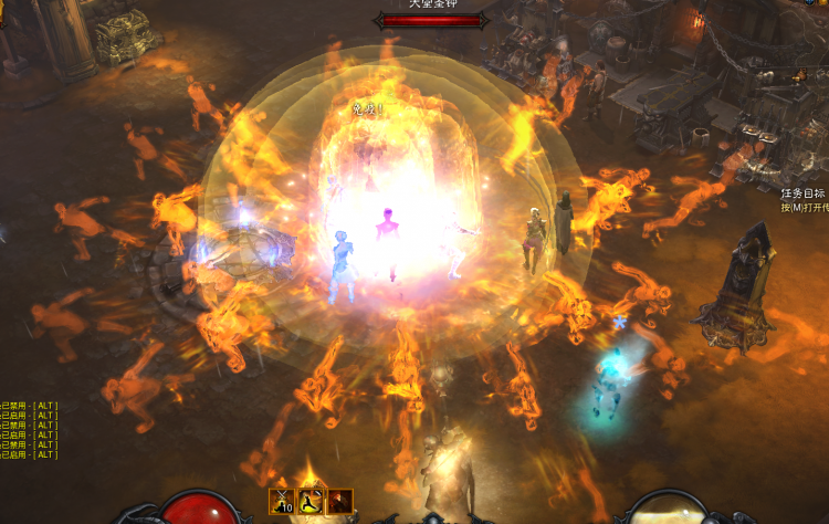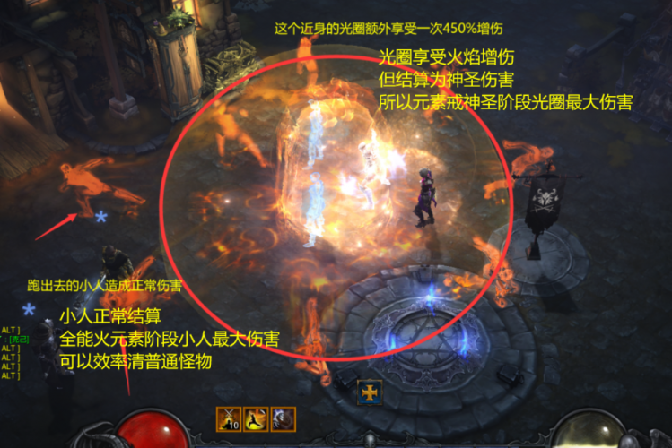 火钟敲响时,钟分为本身的近战范围光圈,以及跑出去的小人,近战光圈是神圣伤害,而小人是火焰伤害,两者都享受角色的火焰元素伤害加成。但是全能法戒的增伤是分开计算的,神圣阶段光圈伤害高,火焰阶段小人伤害高,冲层要打爆发得在神圣元素打。