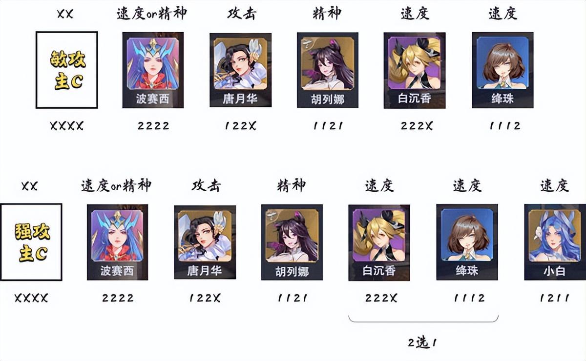 敏攻主c+速度/精神波赛西+攻击唐月华+精神胡列娜+速度白沉香/速度降珠+速度小白