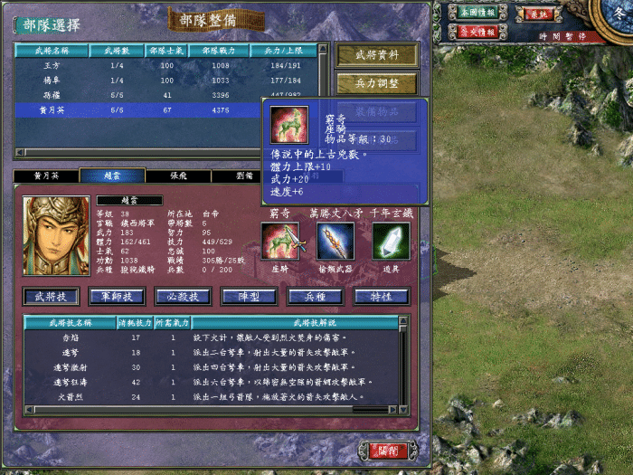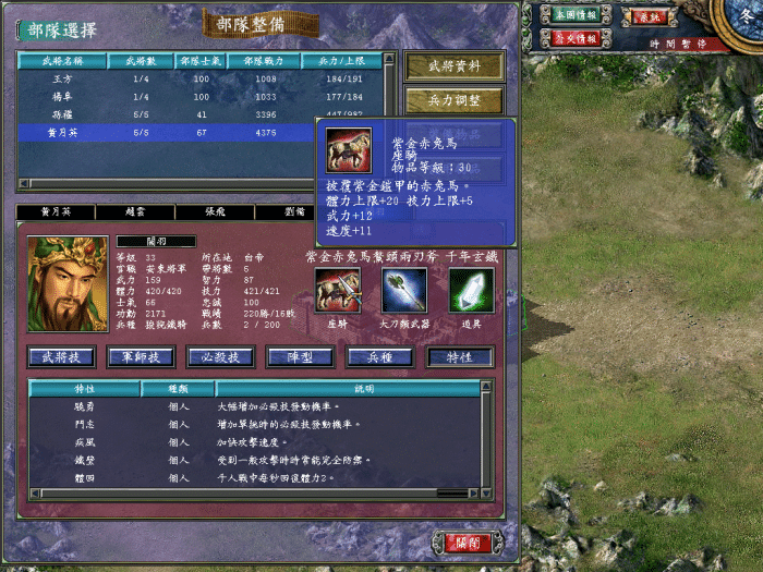 上了30级以后就是各种神兽了,30级就有8种,分别为追风白凰、紫金赤兔马、飞廉、穷奇、四不像、天马、龙马、白玉麒麟。其中追风白凰和紫金赤兔马都是限定一匹的,其他几种神兽限定为5匹。这其中白玉麒麟属性是最强的,各项属性都有加成,武力+20、智力+20、体力+50、技力+50、速度+10,而且还加一个凝神属性,可以更加有效的命中敌人,可以说是五项全能。飞廉(开路:元帅技,大地图上移动速度不受地形影响,皆视同道路。)、四不像(识破:主将技,进入千人战时,有相当高的机率解除敌部队隐形能力)、龙马(斗志:单挑时提高必杀发动率)这三匹神兽则是不加武力值的。穷奇(不屈:兵力低于30%提升必杀发动率,兵力越低,提升越高)、追风白凰(迅雷:攻击速度翻倍)、天马(撤退:个人撤退时,移动速度大幅提高)、紫金赤兔马(铁壁:受到攻击时时常能完全防御)这四批神兽加武力值同时也各有属性。