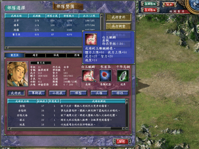 30级以上的坐骑还有三匹,分别是40级的火麒麟、45级的黑麒麟、70级的幼麒麟。火麒麟属性除了武力比白玉比白玉麒麟多一点其它都弱,属性威势(主将技有少许机率使敌方两成士兵害怕逃跑),黑麒麟除了武力比火麒麟多一点,其它和火麒麟是一样的,属性是尸魂(个人杀死敌兵时,有很高机率使其复活成为我方尸兵),幼麒麟各项属性都是顶尖,属性是仁义(主将技有少许机率劝说敌方两成士兵倒戈)。