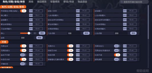 8.开启角色/点数/金钱修改:打开状态界面[F1]开启,打开状态界面修改。八卦/心法/金钱在下次变动时更新数值。