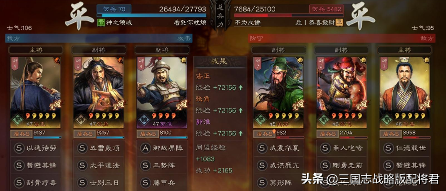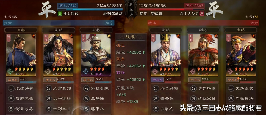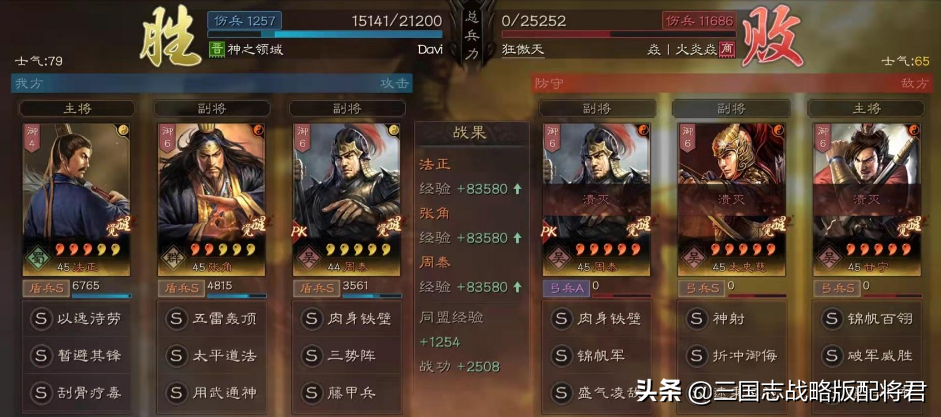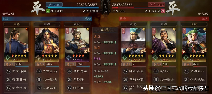 三国志战略版本期内容是要给大家说的是一套由3个平民人气武将组成的阵容,实际情况的部署是“法正+张角+法正”的组合,对于红度的依赖也不高,即便法正张角都是白板也一样可以玩,实战碰撞各种主流队伍真的没怕过!至于郭淮的话,平民玩家也能稳定满红,没啥好说的。接下来就看看这个阵容的战法部署以及PVP对抗强度吧!