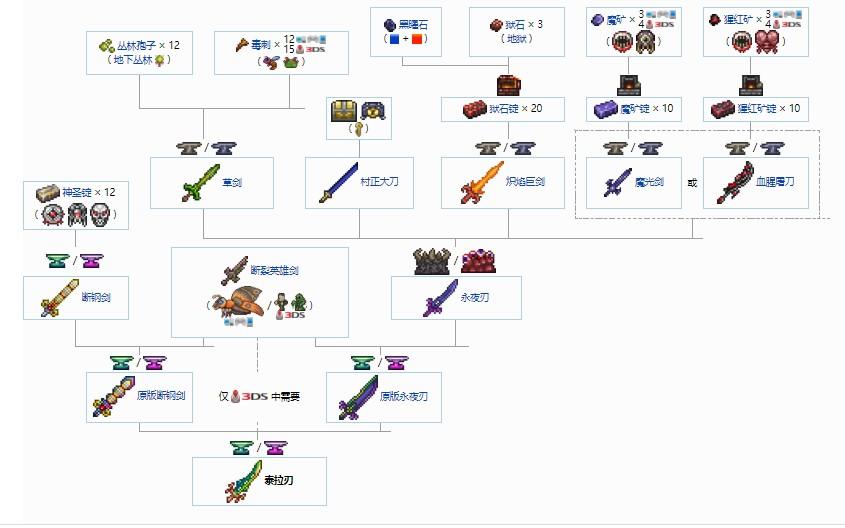 泰拉之刃是一把合成武器,它的合成公式较为复杂,由多把剑合成制作,实际情况合成策略如上图