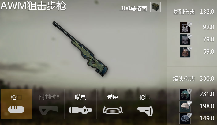 几乎是所有枪战竞技游戏最经典的一把狙击枪也是唯一一把在绝地求生游戏中可行一枪击杀掉三级头盔的武器缺点就是AWM这把武器跟子弹都只能在空投里出现,子弹也是特定的每次空投里有赠送的二十发。萌新玩家估计很难驾驭,但是AWM这把枪受到了很多老玩家的喜爱。(值得注意的是十字弩一样也能秒杀三级头,与AWM成为秒杀三级头的两把武器)