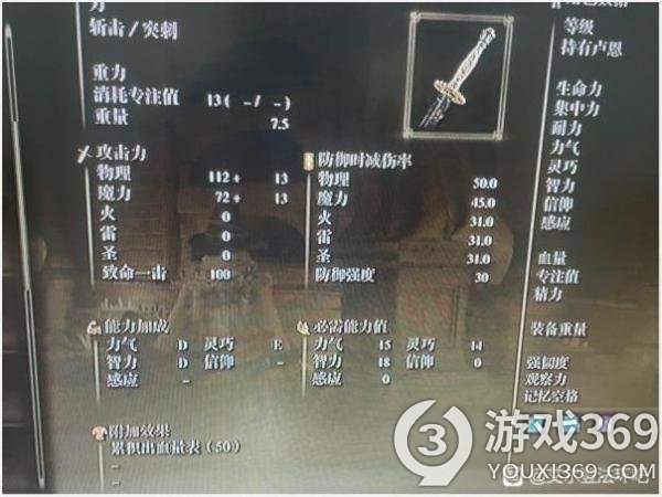智力加成带魔力伤害和出血的太刀,战技是重力,30智力敏刚够拿得动,零强化面板就有200多了。