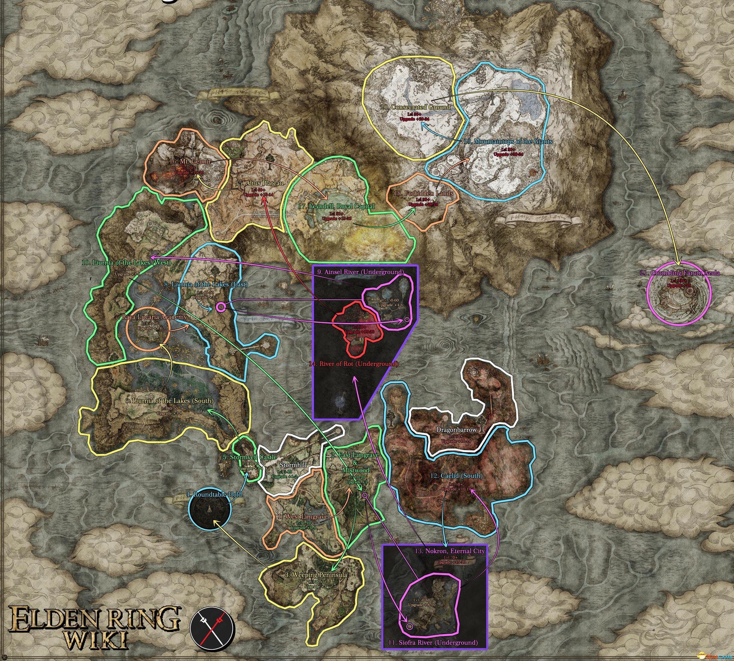 整个交界地的探索顺序可以按照wiki地图指引来进行(点击可以放大查看)。
