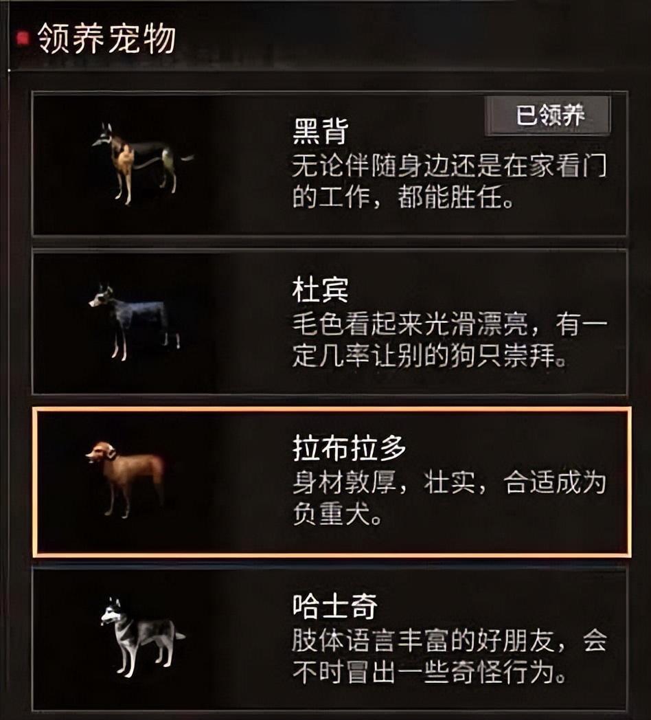 很多新手第一次选狗都不会选。其实狗有三个属性。第一个是看门的,也就是所谓的看门狗,另一个是搜索的,可以帮助玩家在户外搜索补给,最后一个是负重的。前期建议选择搜索型,前期选择其他种类的狗也没关系。你可以在后期花一些新币来改变你的宠物狗的属性,这样前期就可以选得很好,后期也不会浪费新币。