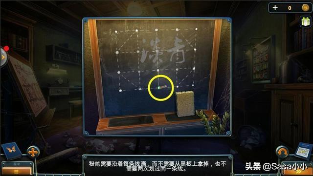 进入小游戏:粉笔需要沿着每条线画,而不需要从黑板上拿掉,也不需要两次划过同一条线;