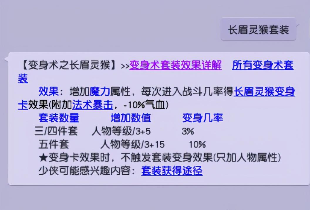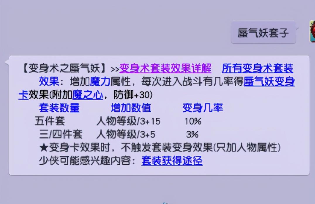 这六种套子的异同还是有的,主要体现在他们的变身后的技能上。我们可以逐个细说每种的变身后的情况,这六类不管几件套的变身几率是相同的,只是差在变身后获得的技能和属性上。