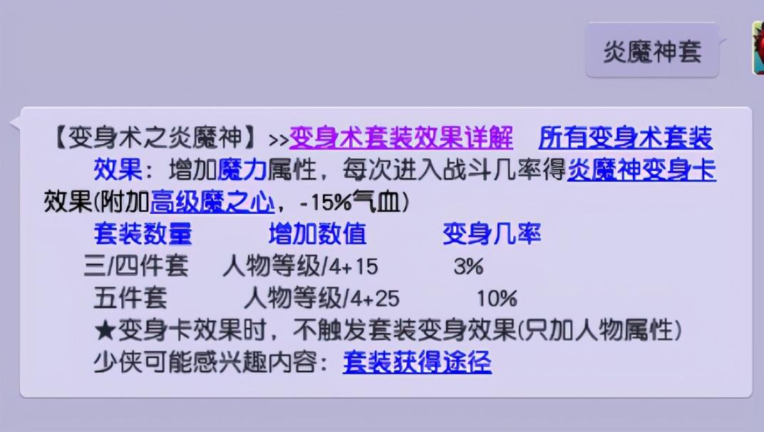 炎魔神套子的变身技能也是高级魔心,同样的逆天效果。但是附带的属性不太好,降低15%气血,想想如果你有5000的血,进去就剩4250的血了。更烦人的是,当你战斗结束变身消失的时候,气血上限是回不来的,直接自带了15%的伤,还得求医生拉一下。当然要是你开了秘制这都不是事。