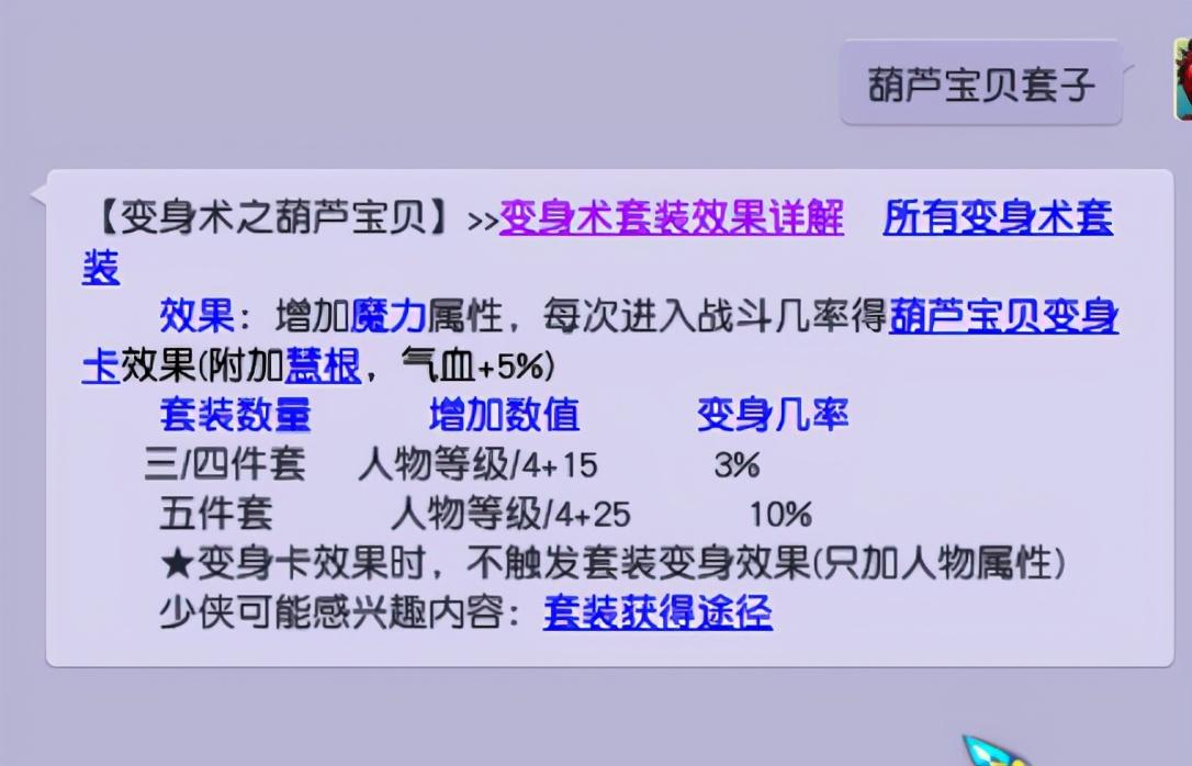 葫芦宝贝的变身技能是慧根,降低蓝耗,对法系来说毫无用处。法系要的是长期降低蓝耗,偶尔一次根本没用。增加的5%气血也没什么用。葫芦宝贝可能是变身技能存在感最弱的套子了。