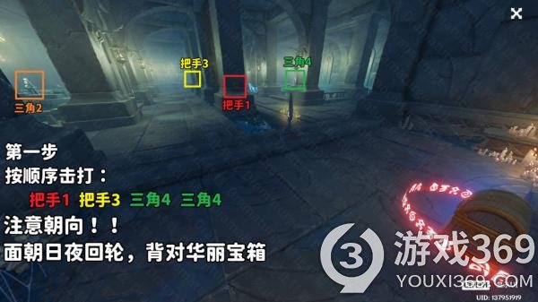 (4)在(3)的基础上,按顺序击打:把手1,三角2,三角2,把手3,三角4。再将日夜回轮转换至“常夜”,即可完成解谜,打开华丽的宝箱,获得另一个「伊达的认可状」。