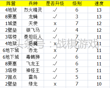 七级兵中最慢的,还是升级后的终极九头龙才7速。未升级的泰坦也是7速的步兵,泰坦升级完直跳11速,也是创下了升级幅度的记录了。但是升级速度变化幅度最大的还不是他,最大的幅度是6,一共3个兵种:火鸟15速直接跳到凤凰21速,天使12速到大天使18速,绿龙10速到金龙16速。还有一个变化幅度是5,猜猜是哪个兵种?