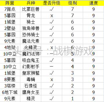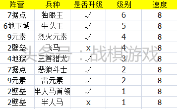 另外这个速度也混杂了各种兵种,最慢的六级兵蛇妖,最慢的飞行部队阴魂,很多未升级的强力部队和升级后的步兵,1级兵速度中第二和第三的怪物和大耳怪王都在这里。