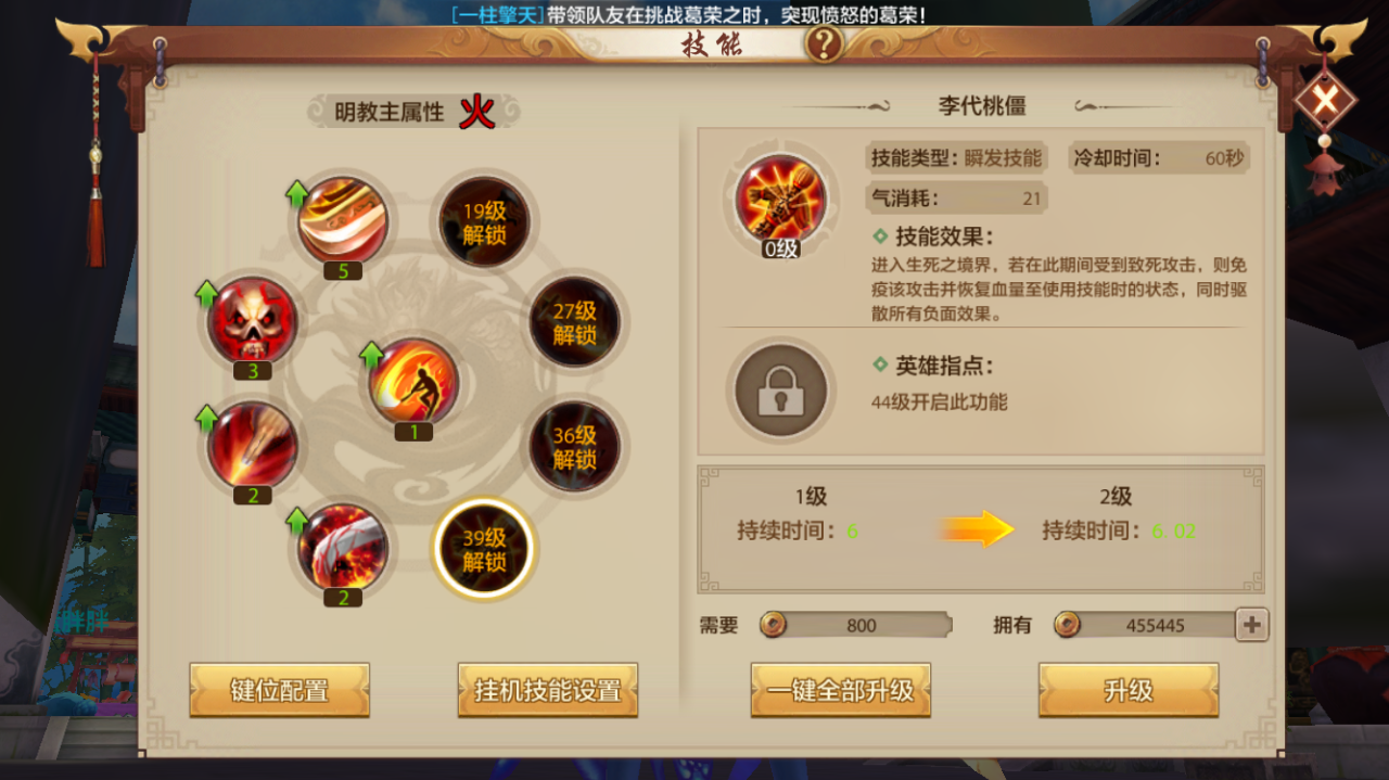 明教还有个神级技能李代桃僵:进入生死之境界,若在此期间受到致死攻击,则免疫该攻击并恢复血量至使用技能时的状态,同时驱散所有负面效果。简而言之就是可以复活自身,合理的使用,这个技能可以在PVP中起到扭转局面的影响力。
