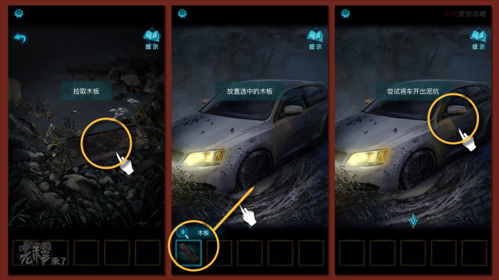 拾取【木板】,点击【木板】放置到车轮下,点击【车门】