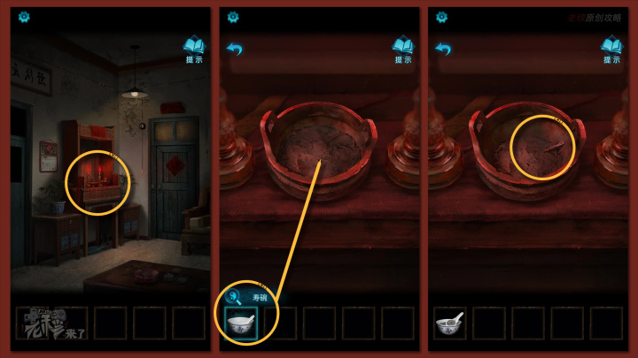 点击【佛龛】,用【寿碗】挖走【香灰】,香炉漏出【香铲】