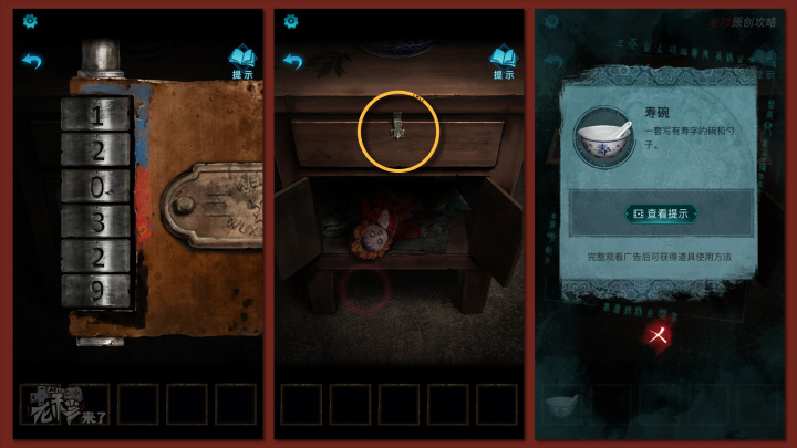 点击【左侧斗柜】,点击抽屉上的【密码锁】,根据挂历显示的线索:蓝红黑顺序,输入【密码】:120329,打开【抽屉】拾取【寿碗】
