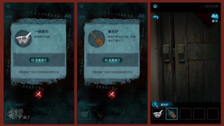 拾取【一碗香灰】【香灰铲】,用【香灰铲】撬开【门栓】