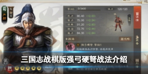三国志战棋版强弓硬弩是s级自带战法之一,技能效果非常强,与它相对应的武将是严颜,因为其技能属性和战法非常类似,并且有相辅相成的影响力,所以该它的效果属性也是需要提前了解的,那么友友们知道游戏里强弓硬弩怎么用吗?感兴趣的话可以和小编一起看看三国志战棋版强弓硬弩使用技巧图解,这些都是本站体验游戏以后的总体评价哦。