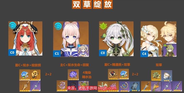 草神作为主要输出角色和植物附加者,其天赋技能也能提供一定的精通加成。妮露和夜兰则作为次要输出角色,一个主要负责绽放效果,一个用于增加伤害,最后搭配心海作为水元素应用和回复支援。
