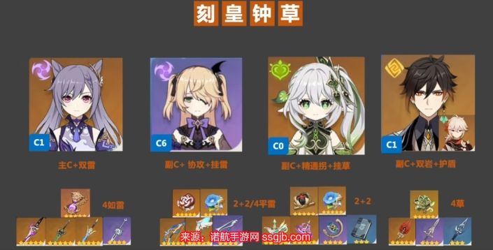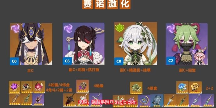 赛诺担任主要输出角色,而另外两个雷元素则充当辅助输出角色。北斗可以提供群体攻击能力和抗打断能力,忍则提供回复支援,而植物神则负责施加植物元素。