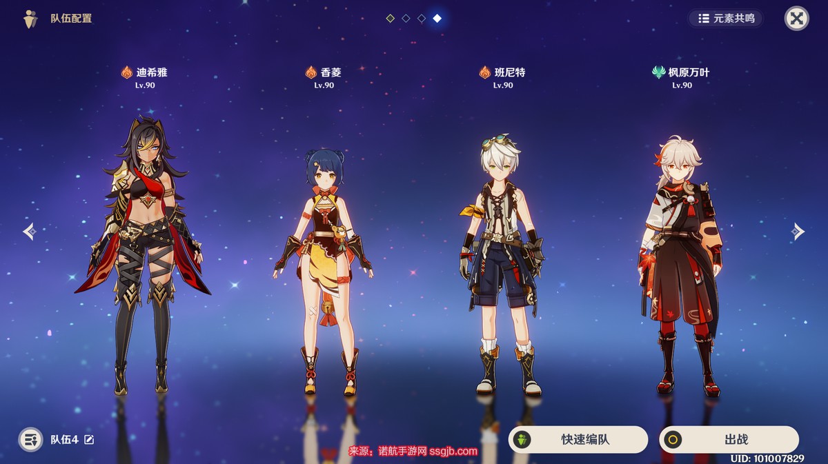 配队角色为:迪希雅+香菱+班尼特+万叶。