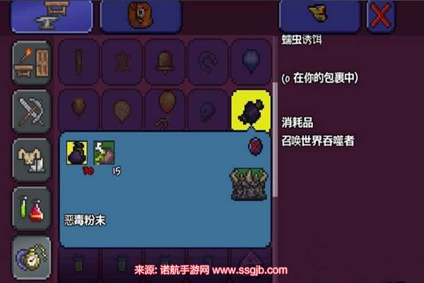 3、消耗15块腐肉和30个恶毒粉末,在恶魔祭坛那合成蠕虫诱饵。